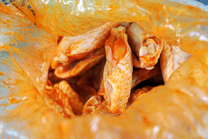 根据食材取适量的腌料,腌料和水按1:1的比例调匀,放入翅中,带上一次性手套抓一抓,让翅中均匀的裹上调料,然后可以装在食品袋中入冰箱冷藏12小时以上。