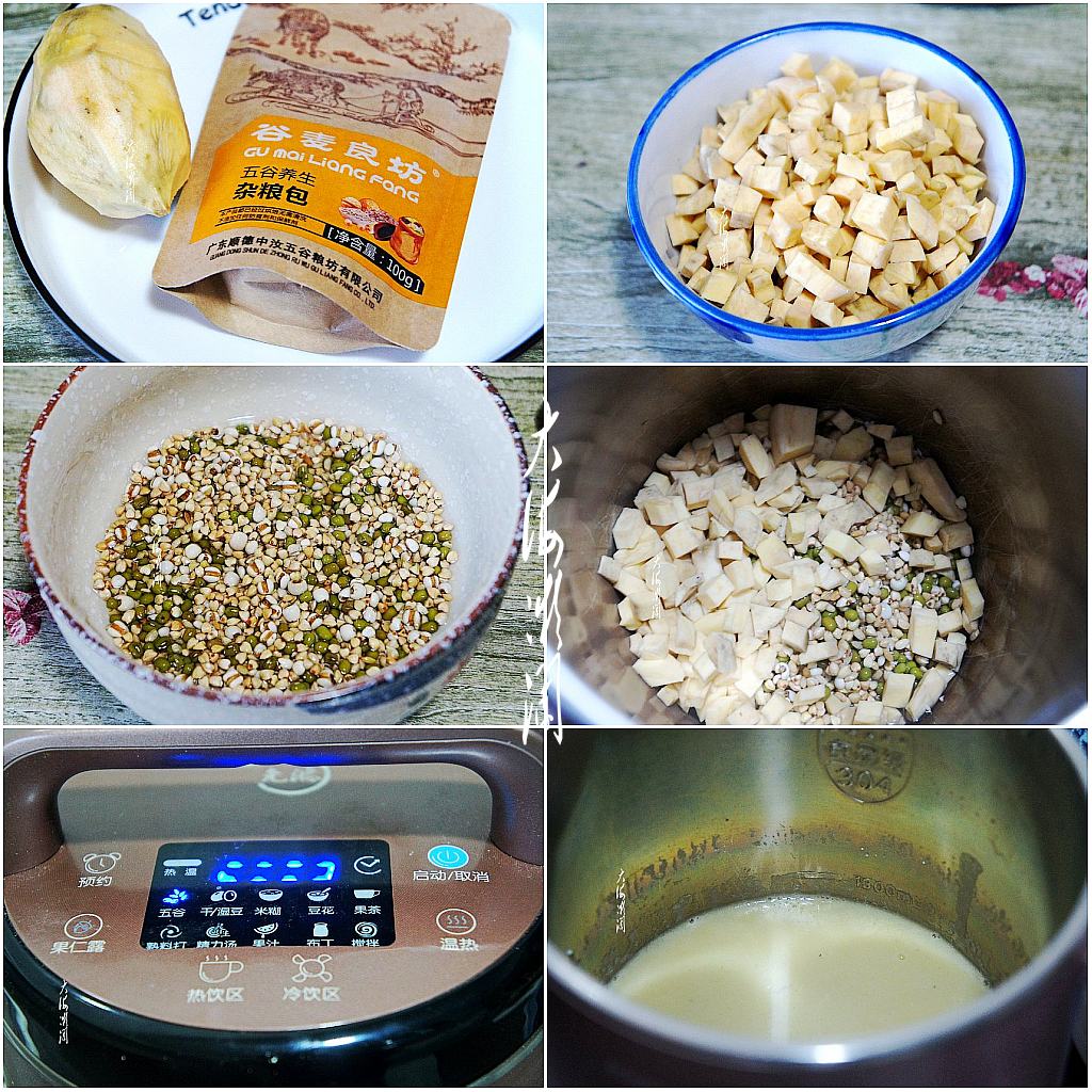 做法:1、红薯去皮洗净,五谷杂粮1包100g,其中包括薏米、糙米、荞麦米和绿豆,而且这些食材都是焙熟的免洗食材,可以直接入破壁豆浆机。