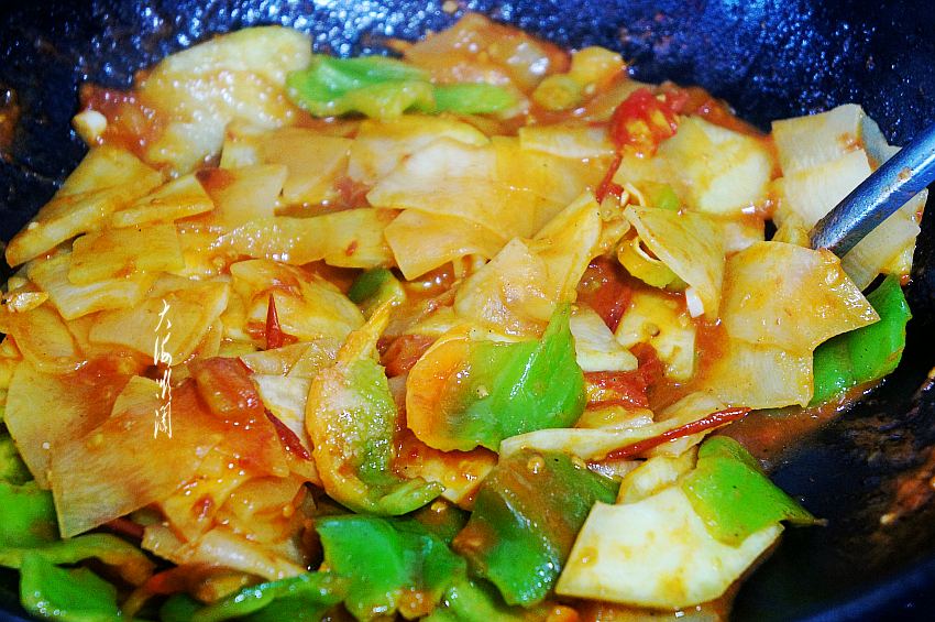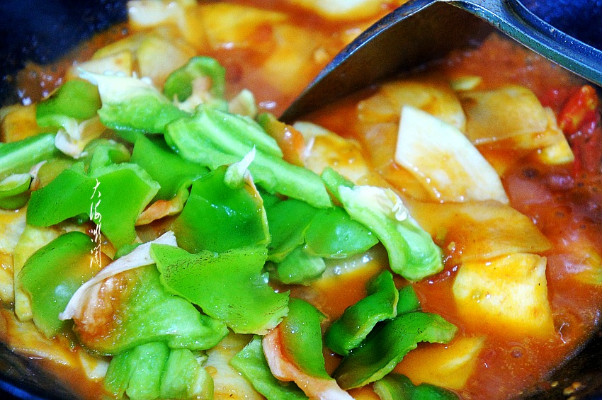 下入青椒翻炒均匀,如果锅中汤汁少,可以少许淋上点水,让青椒更脆嫩。