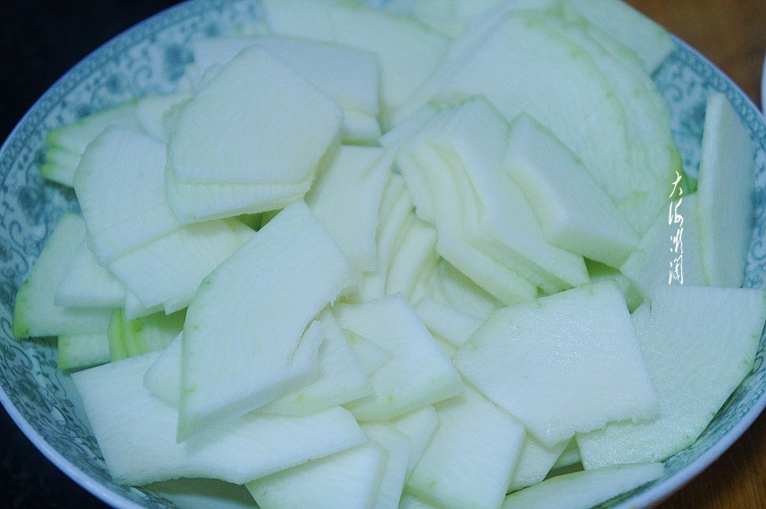 角瓜去皮去瓤洗净,切片,可以切得厚一点。北方这个季节的角瓜都有些老,如果是买的小西葫芦就不要去皮了。