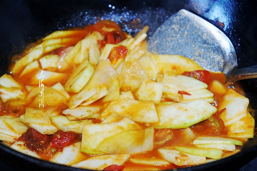 加入角瓜翻炒,炒至角瓜变软。