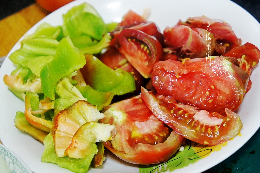 西红柿洗净切块,青椒洗净掰成块。
