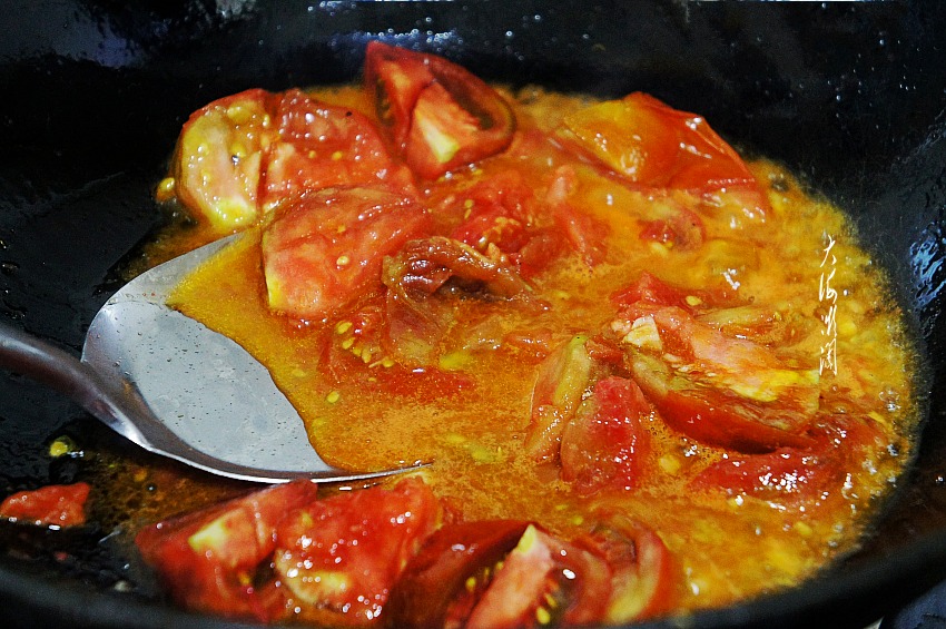 炒锅加入适量的油,撒少许五香粉、葱花爆出香味,加入番茄翻炒,炒至番茄出浓郁的汤汁。