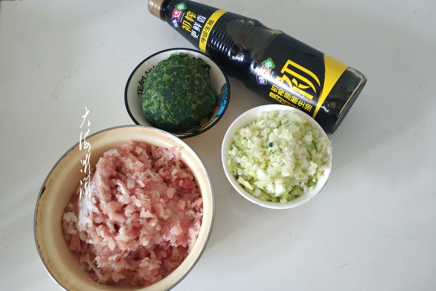 葱去皮洗净切碎,姜去皮洗净切碎,猪肉去皮洗净剁碎,萝卜缨子切碎。