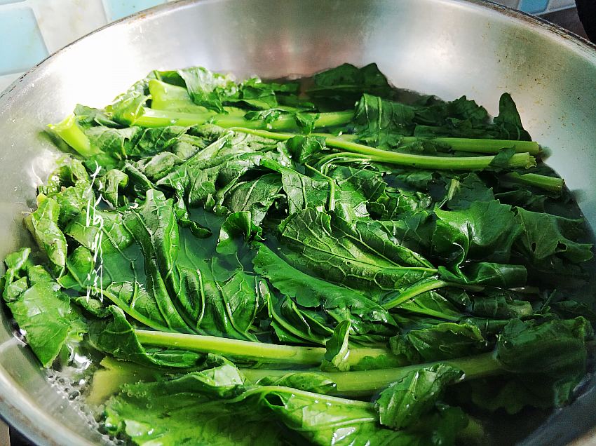 萝卜缨摘洗干净,这是昨天回乡下,拿来自己家种植的大萝卜和萝卜缨子,非常新鲜,无农药无化肥,清洗干净就好。锅中加入适量的水,水开加一勺盐,下入萝卜缨子焯一下,然后捞出过冷水,攥掉水分,加盐保持颜色的鲜艳。