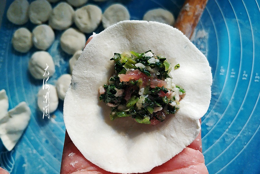 【萝卜缨猪肉馅水饺】所需食材:饺子粉300 g;猪肉300g;萝卜缨1把;油、盐、生抽、料酒、蚝油、花椒、八角、桂皮、葱、姜各适量。