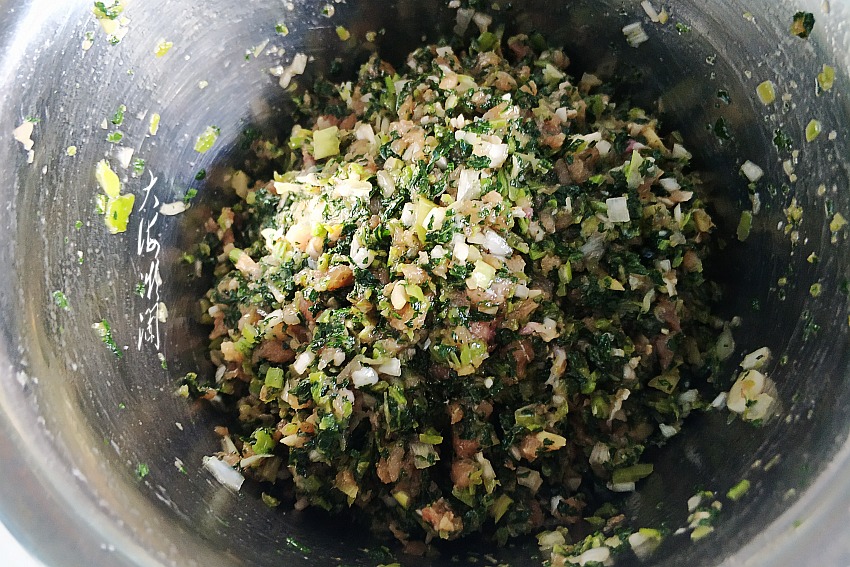 猪肉馅加少许老汤、葱姜末、盐、生抽、料酒、蚝油沿一个方向搅拌上劲,将刚刚炸熟油浇在肉馅上搅拌均匀,加入萝卜缨拌匀就OK了。