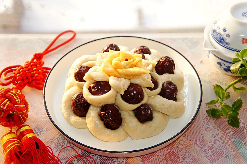 做法:酵母加温水溶解后加入面粉中,和成面团反复揉匀,盖上保鲜膜,饧发1小时,取出揉匀排气。将面团留出5个小面剂子,做第二层和第三层,剩余部分揉成长条,对折,放上红枣,像编辫子一样扭成花样。然后首尾相接,形成环状,这是第一层,也是底层。然后将3个小面剂子擀成小饼。每个饼上边放两个红枣,然后在中间捏紧,排成一排,用筷子一夹就是一朵花。码在刚才做好的底层上。将第4个小面剂子擀成圆饼,均匀分成6份,用叉子压花纹,然后将每一瓣捏在一起。码在上边,这是第三层。