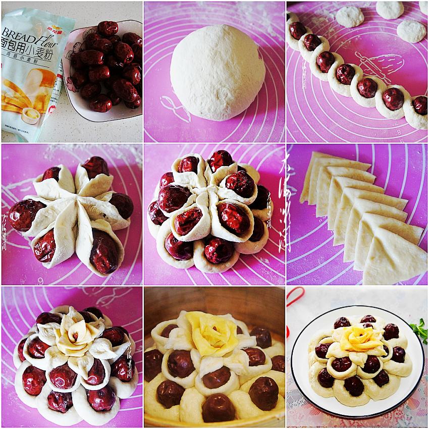 【花样枣糕】食材:面粉300g;酵母3g;红枣适量。