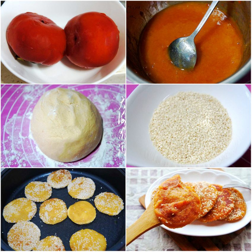做法:柿子洗净,去皮去蒂,入料理机打成汁,加入面粉和糯米粉,和成面团,面团要软软的不沾手就好。将面团均匀地分成若干小面剂子,用手压扁,两面蘸上一层芝麻,煎烤机刷一层底油,中温设置10分钟,放入芝麻柿子饼,两面烙熟就OK了!香甜软糯,百吃不厌!