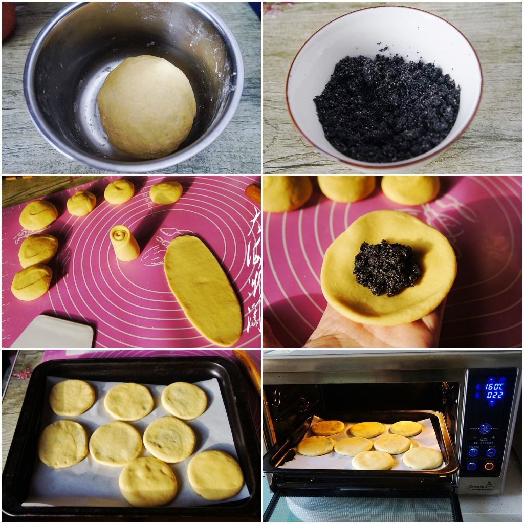 做法:熟黑芝麻放入料理机中,打碎,加入适量的橄榄调和油,不要加多,略黏稠就好,适量的糖,1g盐,甜中有咸,不油腻特别香。鸡蛋打散,加入牛奶、酵母融化后,筛入燕麦粉揉成面团,然后盖上保鲜膜,饧发至2倍大,取出揉匀排气,均匀分成8等份,取一个面剂子擀成长椭圆形,由上往下卷起来,顺过来再擀长,再卷起来,这样做口感更松软。然后按扁,擀成小饼,放入拌好的黑芝麻馅,收口捏紧,不要露馅,按平擀圆码入烤盘。烤箱160度预热5分钟,上下火中层,160度烤20分钟左右,注意10分钟左右翻面。没有烤箱,平底锅烙也是可以的。