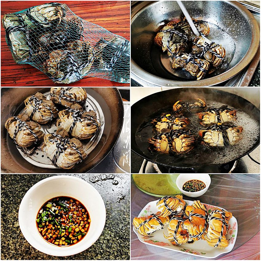 做法:这是在阳澄湖边上吃的大闸蟹,新鲜的大闸蟹冷水冲洗,锅中加入适量的水,放上蒸帘,注意,冷水下锅,大闸蟹肚腹朝上码入蒸帘,这样可以防止螃蟹里边的蟹黄流出来。盖上锅盖,4两大小的大闸蟹冷水下锅,蒸15分钟关火恰到好处。做个调味汁,葱去皮洗净切碎,姜去皮洗净切碎,可以多加点姜,加入适量的糖、醋、海鲜酱油调味,这个调味料也可以和大闸蟹一起蒸,还可以炸点油浇上,总之,这个蘸汁可以随自己喜欢的口味调整。