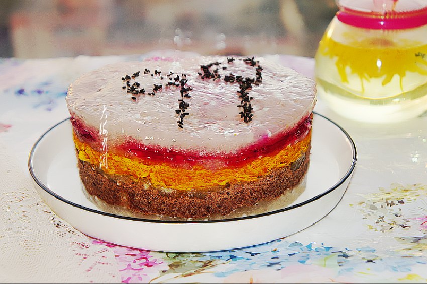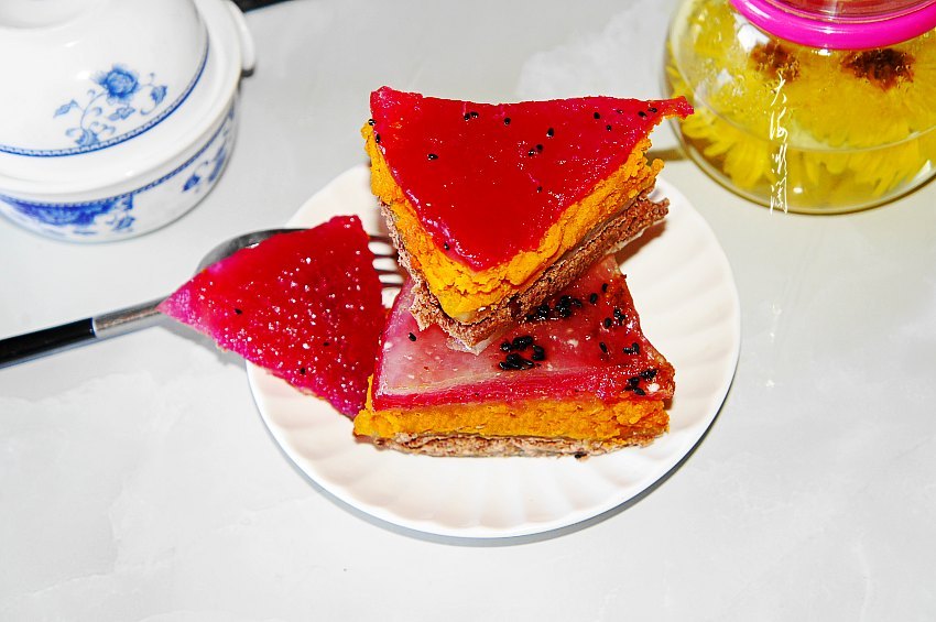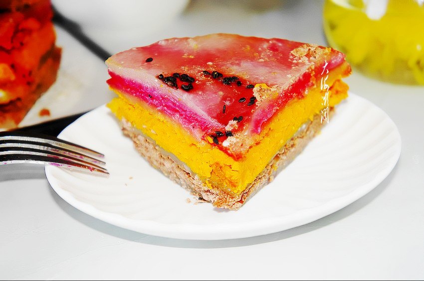 南瓜能润肺益气,保护胃粘膜,降糖止渴,且热量很低。丰富的膳食纤维,既有很强的饱腹感又能促进消化,在美容养颜上也具有一定的功效。再加上火龙果富含植物性白蛋白及花青素,丰富的维生素和水溶性膳纤维。具有抗氧化、抗自由基、抗衰老的作用。这款重阳糕共有7层,五彩缤纷,既有利于健康,还有步步登高的寓意,是重阳节送给爸妈最好的礼物啦!