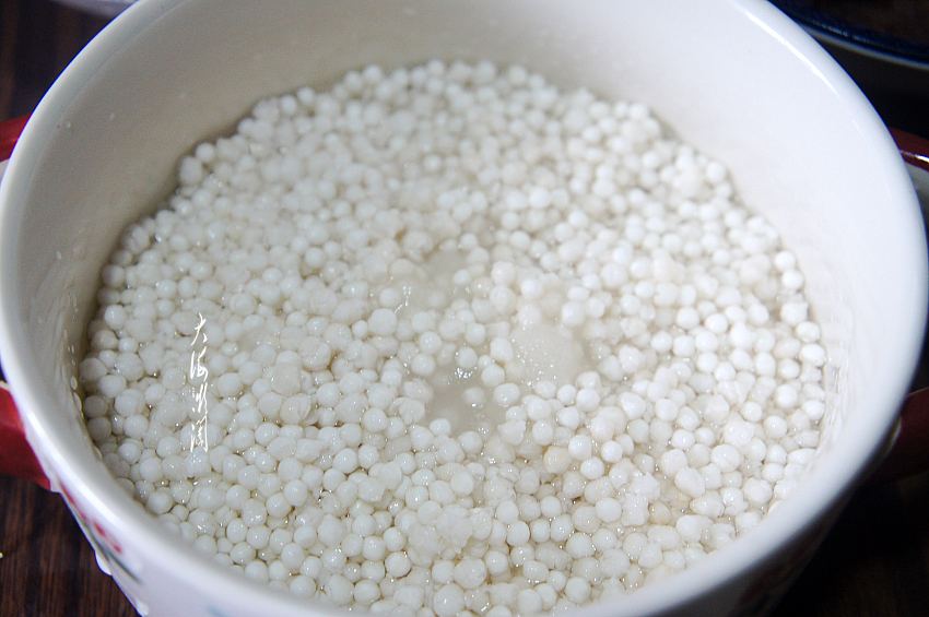 西米各大超市都有售的,价格也不贵(没有可以换成糯米粉和粘米粉),加入适量的白糖,白糖用量根据自己的喜好添加,喜欢甜口多加点糖,加入没过西米的纯净水,浸泡15分钟。