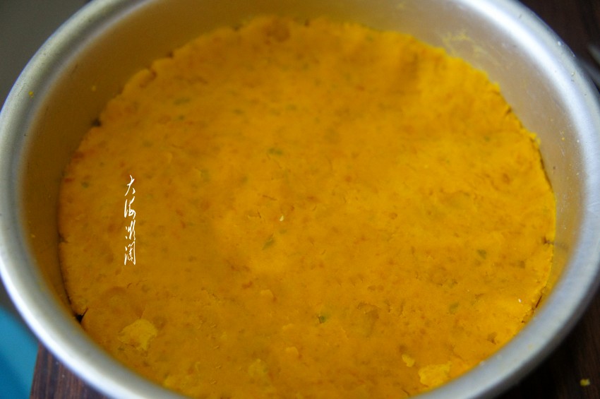 取适量的南瓜泥拍成圆饼,码入模具为第4层,然后再码一层西米面饼为第5层。