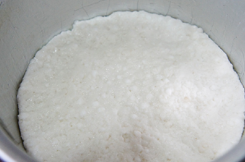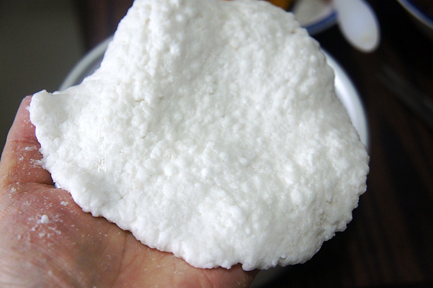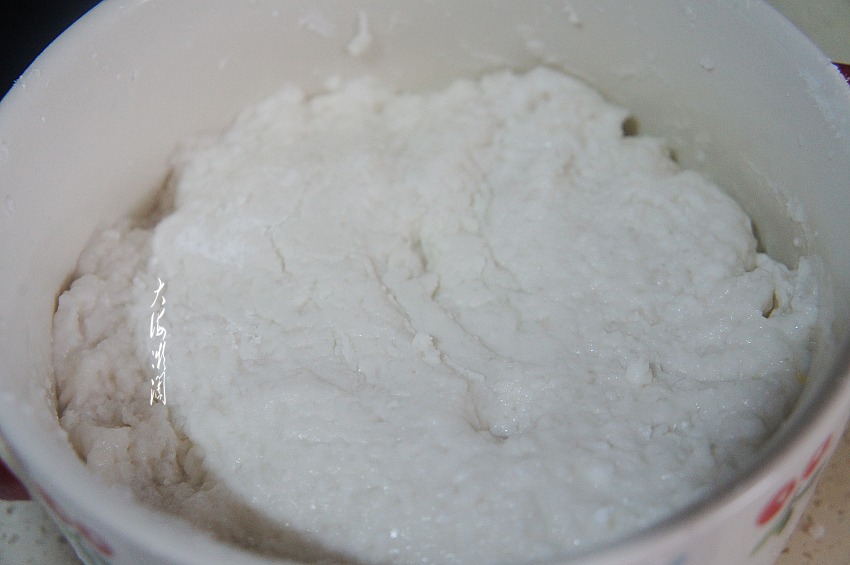 颗粒基本泡开就好,用筷子搅拌一下就碎了,加入玉米淀粉,揉成面团。