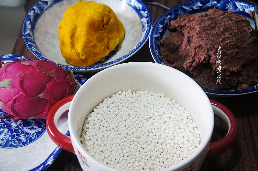 【重阳糕】所需食材:西米200g;南瓜半个;芸豆150g;火龙果1个;玉米淀粉50g;白糖适量;冰糖适量;牛奶少许。黑芝麻少许;桂花汁适量。