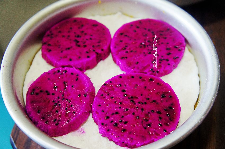 火龙果水分比较大,不用打碎,直接切片,码入模具中。用小块填满边边角角。