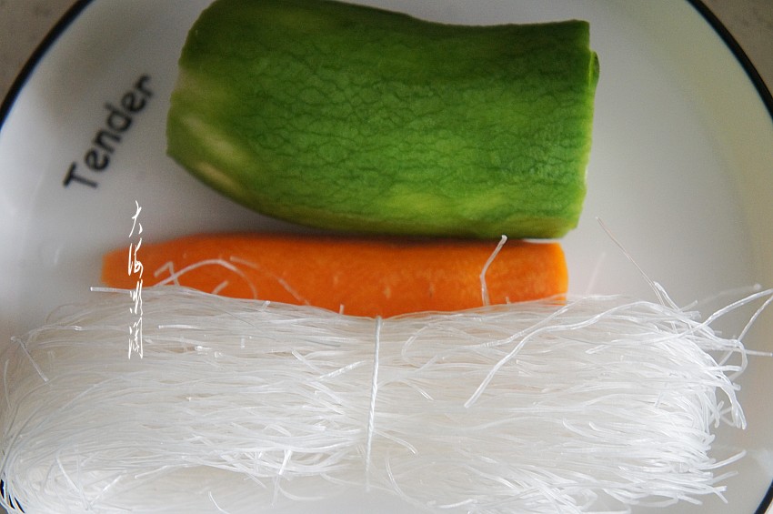 准备食材,萝卜、胡萝卜都是姐家自家产的有机食材,去皮洗净备用。粉丝洗净备用。