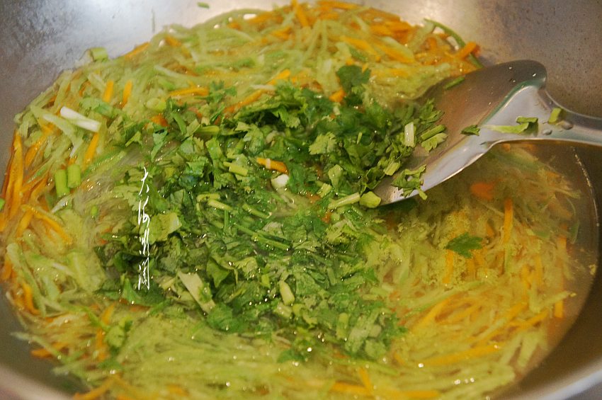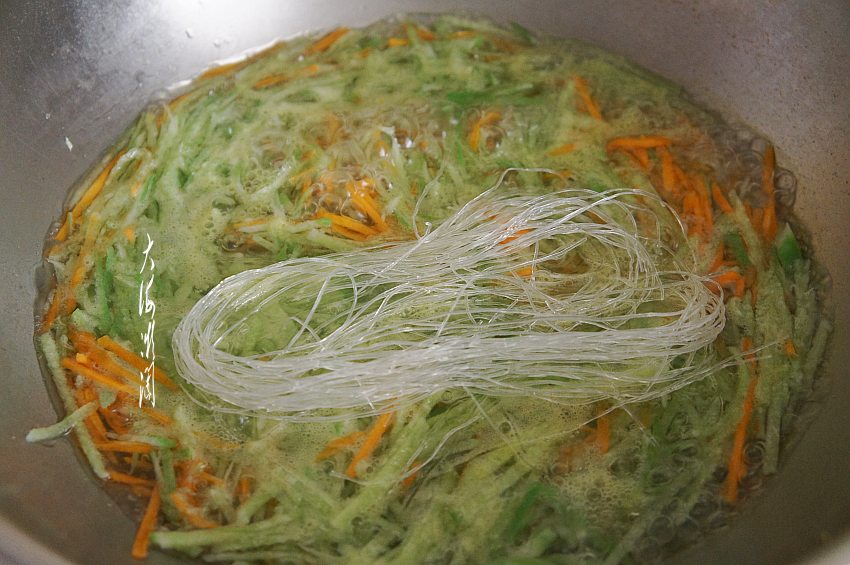 再次煮开,待萝卜丝和胡萝卜丝基本煮熟,下入粉丝,继续煮开。