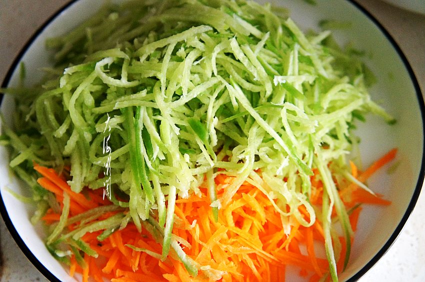 萝卜和胡萝卜分别用擦丝器擦丝备用,如果喜欢粗条的可以切条。