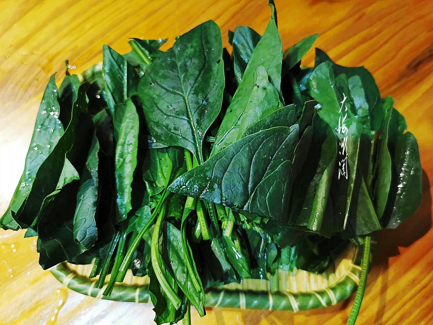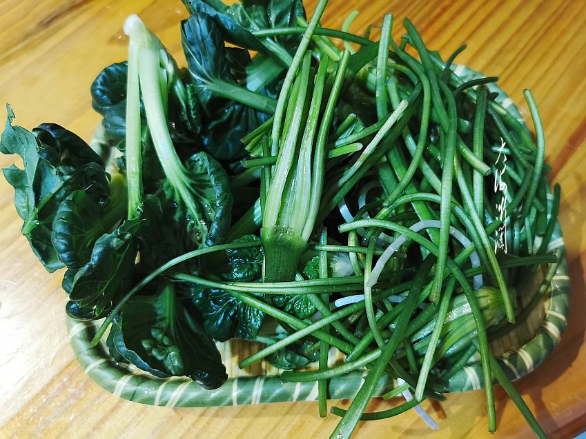 套餐还有两种蔬菜,老板娘说不够可以加。这种蔬菜叫水性杨花,在泸沽湖边上浅水处,随处都可以看到这种开着白色小花的植物,是生长在湖泊中的一道野菜,花因水波流动而随波逐流,因此得名水性杨花。