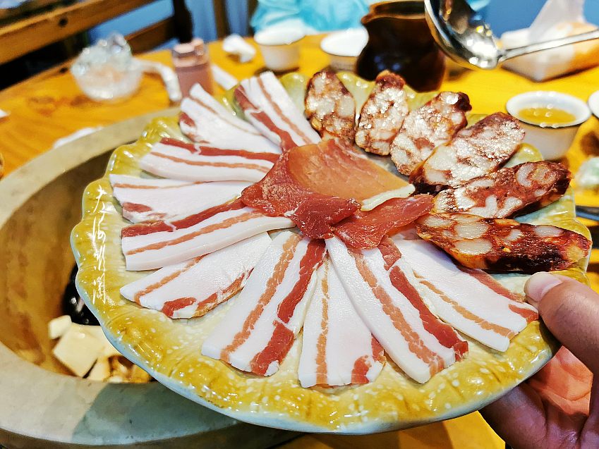 这一盘是五花肉和腊肠,老板娘每次都快速倒入锅中,终于抓拍到这一盘了,鱼锅有肉,当然是香的不要不要的啦!