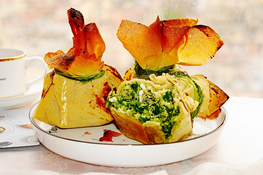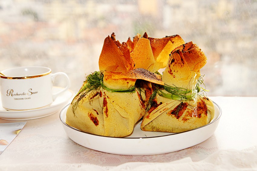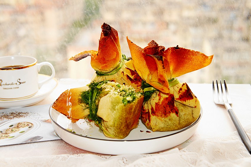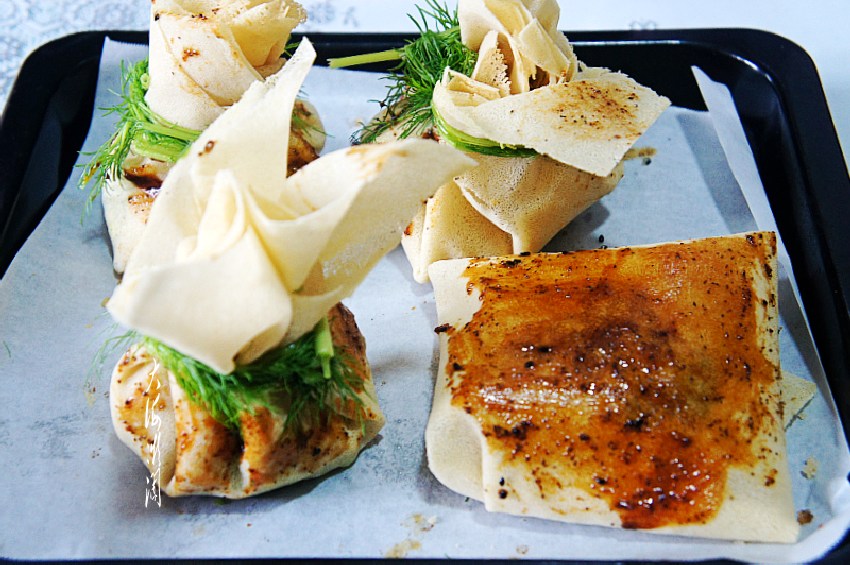 【茴香馅灯笼包】所需食材:煎饼4张;茴香300g;葱适量;鸡蛋2个;油适量;盐适量;胡椒粉适量;蚝油适量;烧烤酱适量。