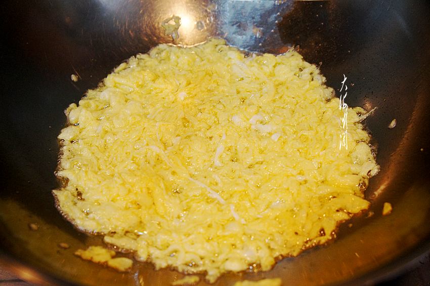鸡蛋打散,少许加点料酒去腥,搅拌均匀,锅中加入适量的油,可以多加一点油,拌馅时不另加油了,油开后倒入蛋液,边倒边搅拌,尽量搅拌的碎一些,晾凉备用。