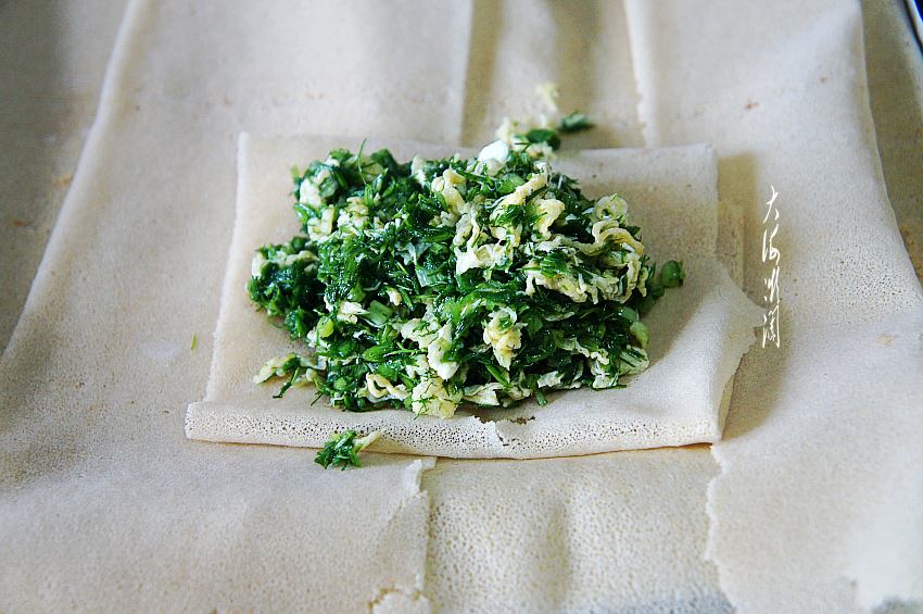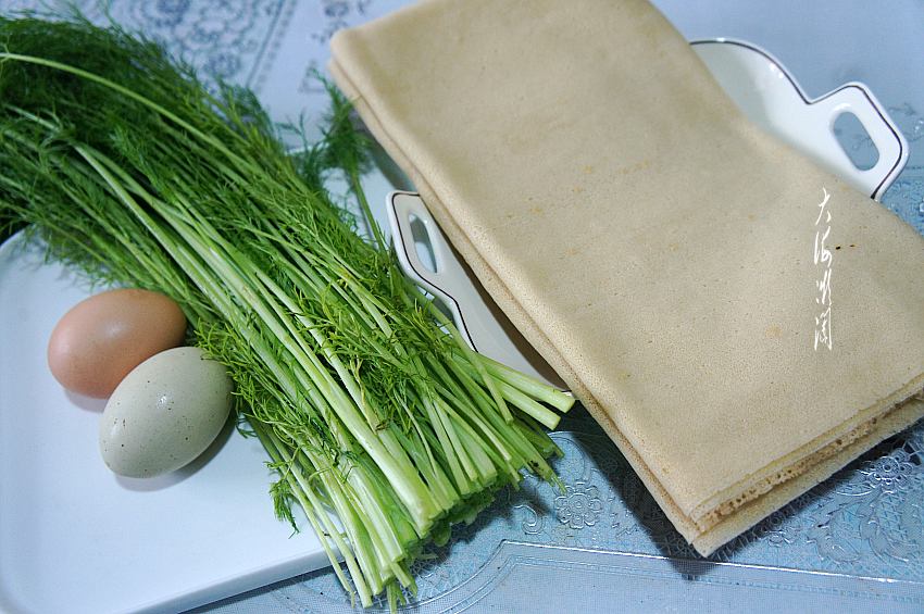准备食材:买回来的茴香摘洗干净,煎饼也是买现成的,没有可以换成面粉和成面团,也是一样的。