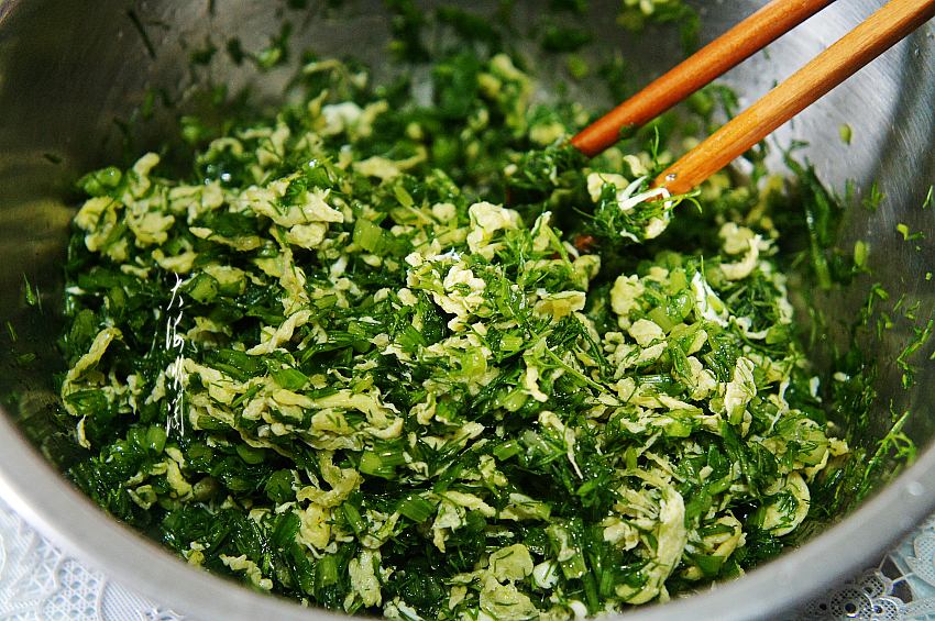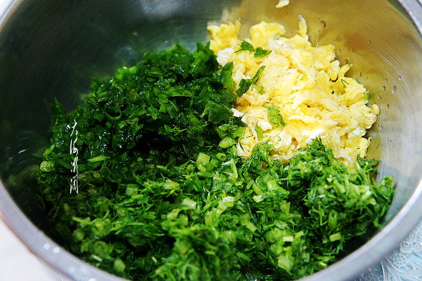 洗干净的茴香切碎,撒些盐,腌制10分钟,然后攥掉水分。