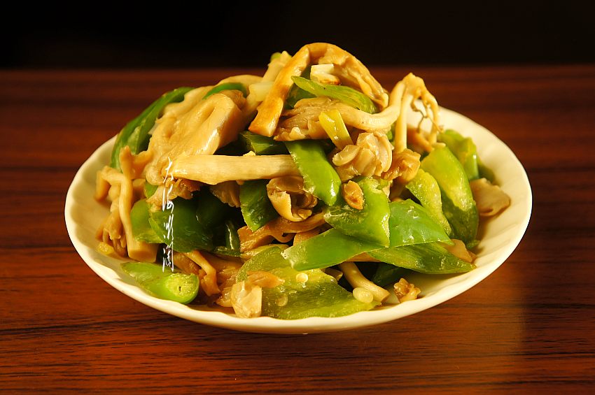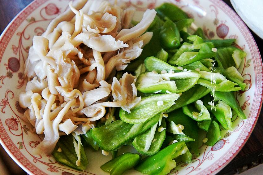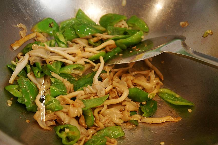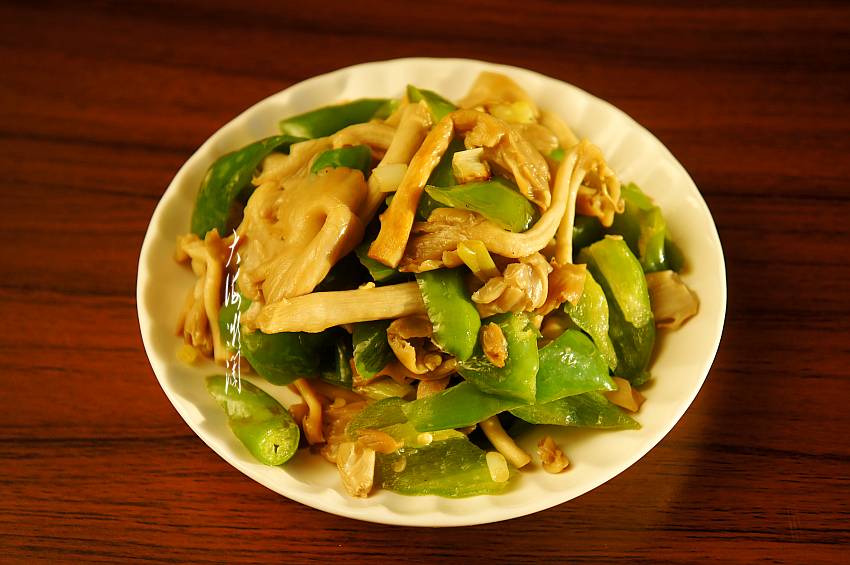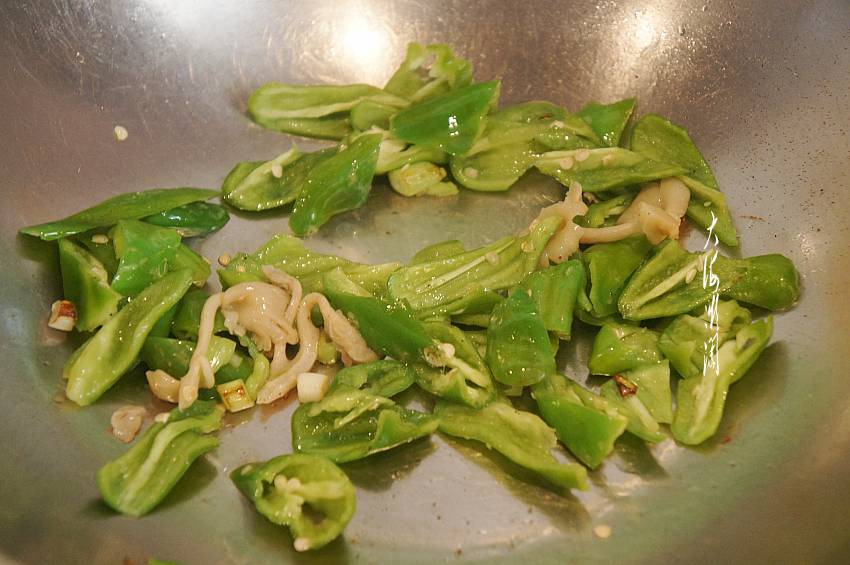 下入焯过水的榆黄蘑,翻炒均匀,少许淋点水,炒出来的辣椒口感更脆嫩。