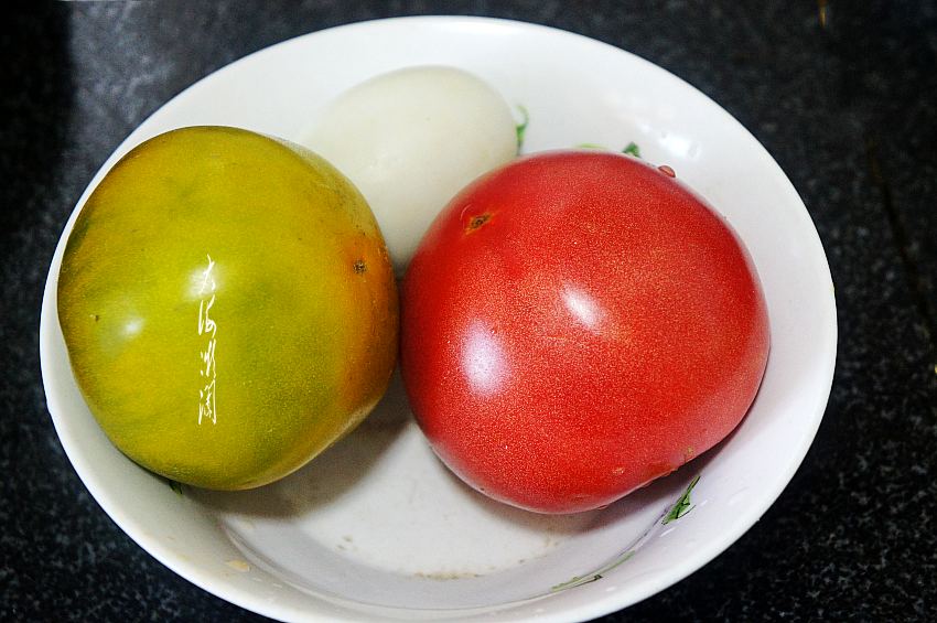 选两个西红柿,一红一绿,都是熟透的西红柿,在淡盐水中浸泡10分钟,反复清洗干净,或者开水烫一下去皮。