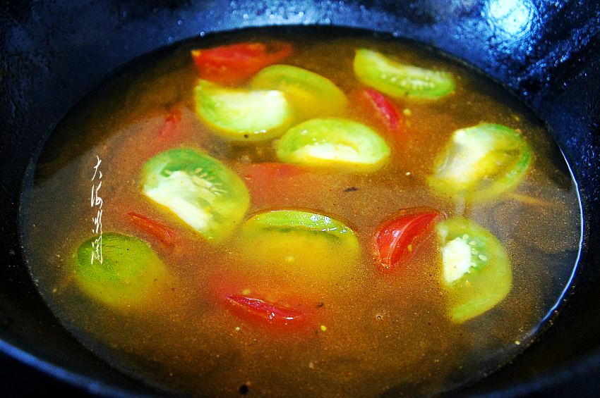 炒锅加入适量的油,爆香葱花、五香粉,下入西红柿块翻炒均匀,炒至出来汤汁为好。加入适量的水,大火烧开。