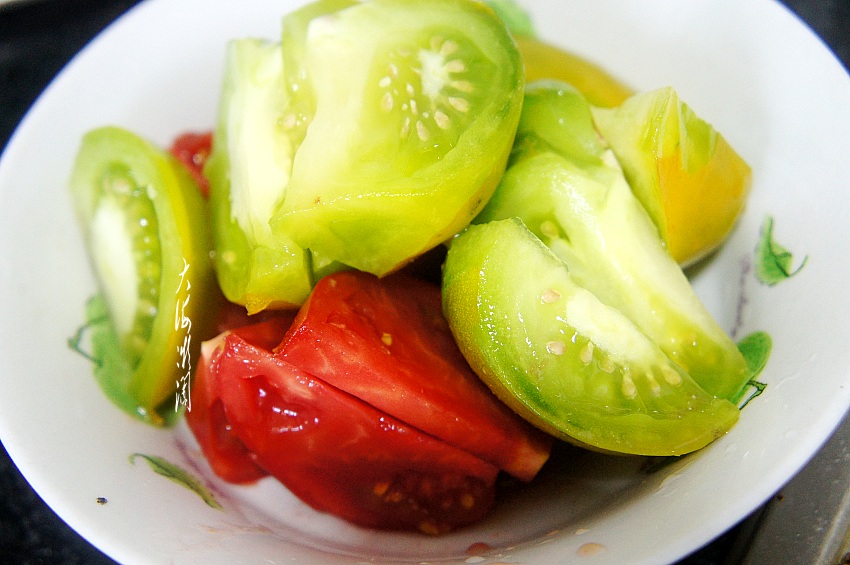 清洗干净的西红柿,根据个人喜欢的口感,可切小块也可切大块。