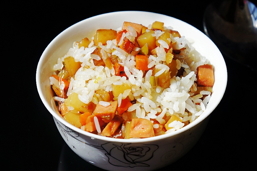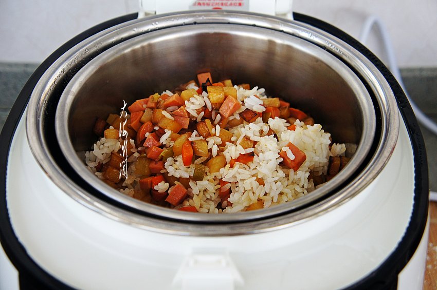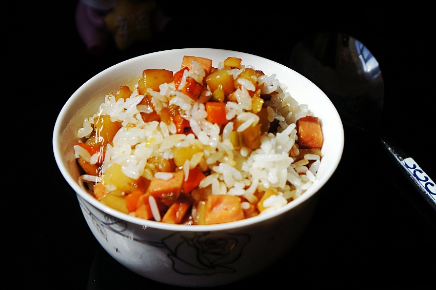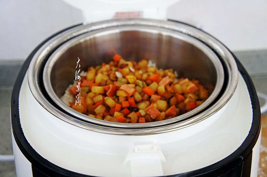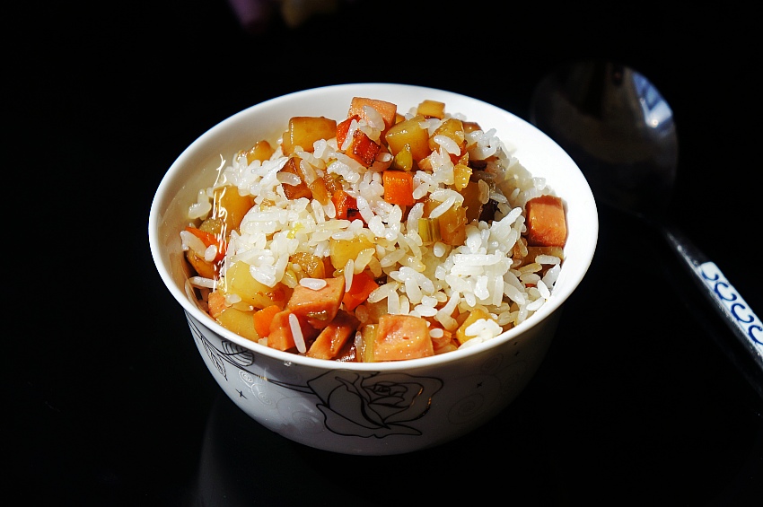 其实,这饭做起来也很简单,蒸饭之前,把蔬菜切丁入锅炒一下,然后直接和米饭一起蒸,别看多加这一步,孩子超级爱吃,白米饭一口不动,加了蔬菜的米饭能吃两碗,甭担心会不会发胖,正值长身体的孩子,每天跑跑颠颠,运动量大,消耗的能量多,需要补充的能量自然也多,吃得饱才能长得快是吧!更何况我用的是脱糖电饭锅,通过水米分离技术有效地溶解掉米饭中多余的淀粉,从而降低大米糖分的含量,又保留着营养不流失,再加上素有小人参之称的胡萝卜丁和素有地下苹果美誉的土豆丁,好吃还有营养,多吃还不长肉。