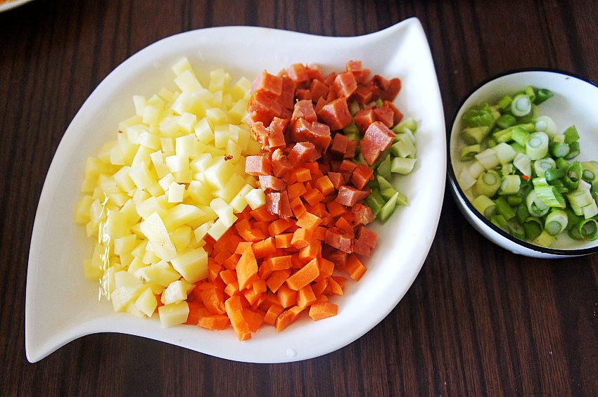 胡萝卜和土豆去皮洗净,分别切丁,火腿肠去皮切丁,葱去皮洗净切碎。作为家常菜,胡萝卜和土豆的营养值都很高,胡萝卜中的维生素A是骨骼正常发育的必需物质,有利于细胞的生殖与增长,孩子常吃对生长发育非常有好处。土豆被称为“十全十美”的食物,也是众所周知的抗衰老的食物,有很好的呵护肌肤、保养容颜的功效,同时因含有丰富的膳食纤维可以起到通便排毒和清肠刮油的作用。减肥的路上,这两种食材也是非他莫属。