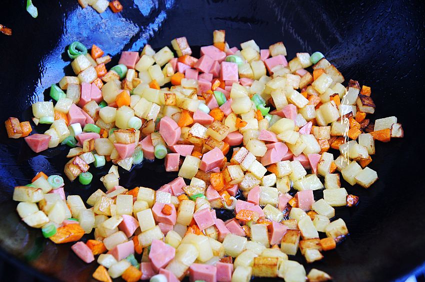 炒锅加入适量的油,爆香五香粉和葱花,加入胡萝卜丁、土豆丁和火腿肠丁翻炒,加入适量的盐、生抽调味,翻炒均匀出锅。