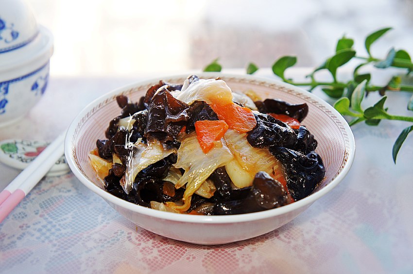 非常美味的家常小炒,食材简单,家家都有,黑白配,再加点胡萝卜,黑白红三色也是最佳搭配,养分足,养分还能相互补充,不但适合冬天滋补,五色补五脏,黑色补肾,白色润肺,红色补心,而且在补充营养的同时,还能清理肠道,排出体内垃圾。黑木耳是生活中很常见的菌类食材,味道鲜美,风味独特,高蛋白低脂肪,被称为素中之荤。含有丰富的维生素、纤维素以及多种人体必需的矿物质,丰富的植物胶原成分,具有较强的吸附作用,能够帮助排出体内的油脂、垃圾及毒素,起到清肠刮油,排毒养颜的作用。