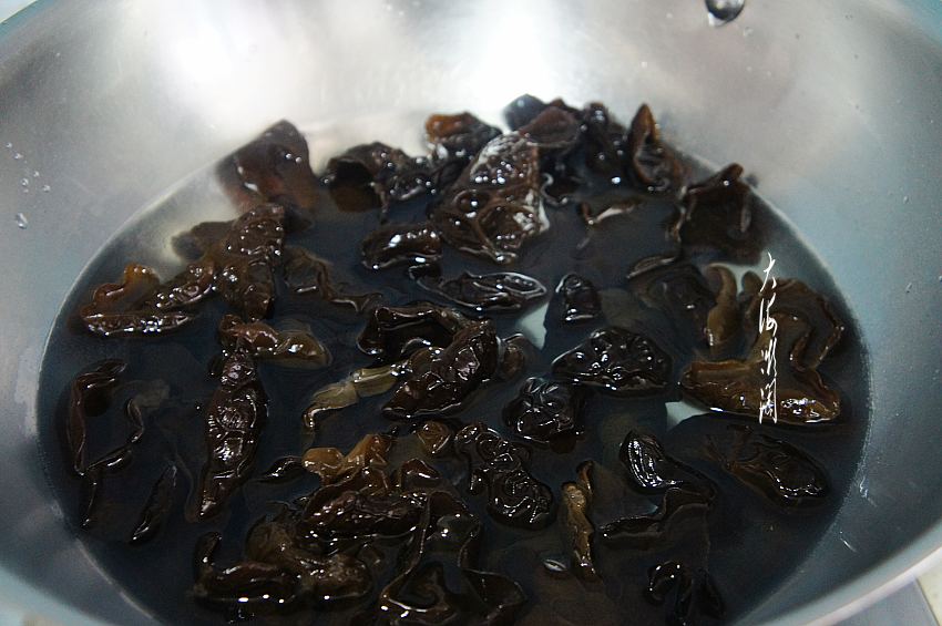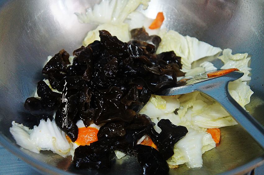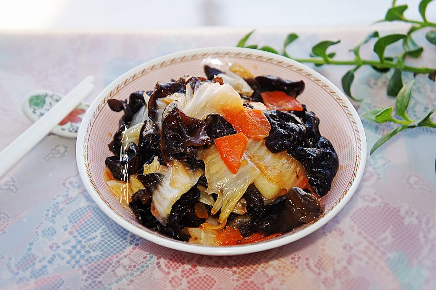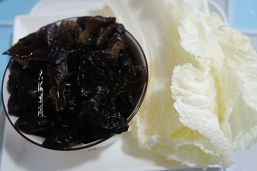 干黑木耳1把,冷水浸泡后,清理掉杂质,白菜在淡盐水中浸泡10分钟左右,反复清洗干净。