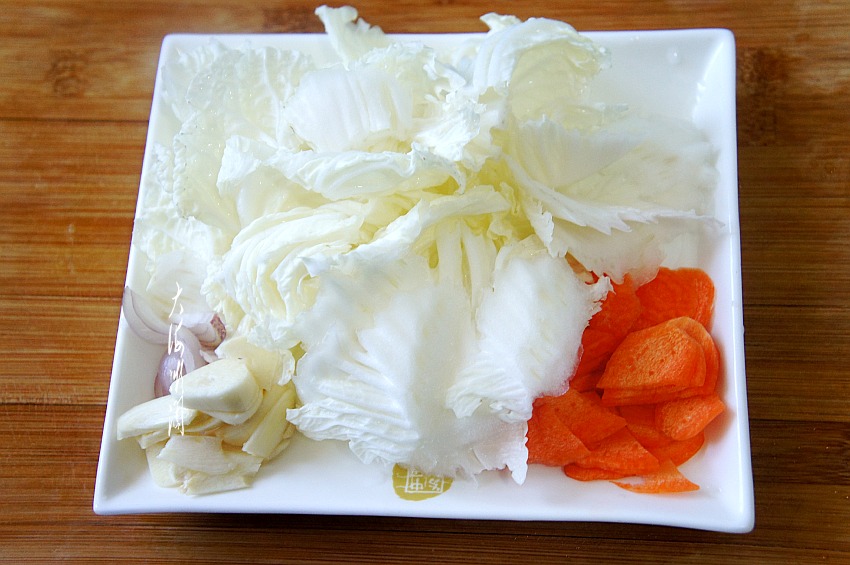 洗干净的大白菜斜切薄片,胡萝卜去皮洗净,切片,葱蒜去皮洗净切片。