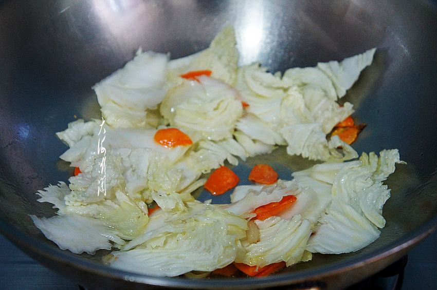 下入白菜片翻炒至白菜变软。