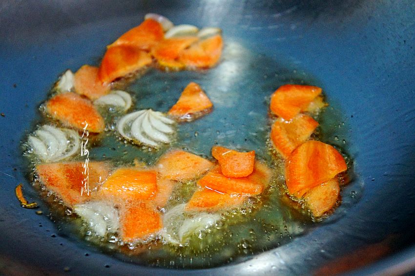 炒锅加入适量的油,爆香葱蒜和五香粉,留少许蒜片出锅用,下入胡萝卜片翻炒变色。