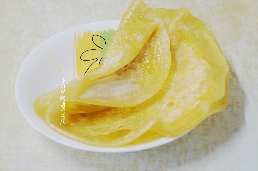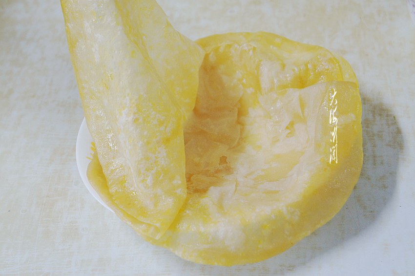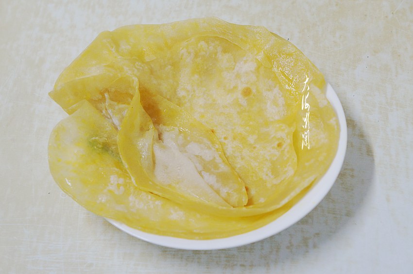 然后将摞在一起的饼擀成薄饼,越薄越好。