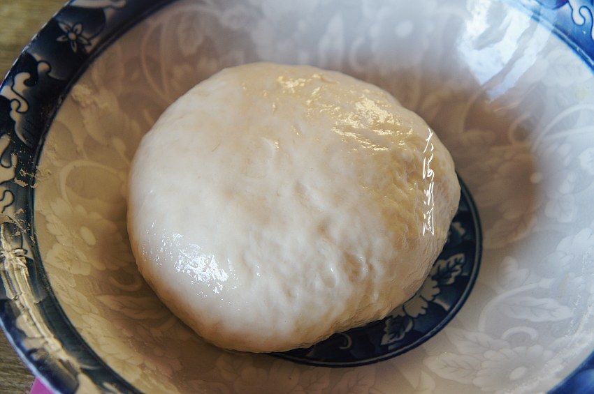 和面,面粉放入盆中,温水中少加一点点盐,面粉中慢慢倒入温水,面粉全部搅拌成絮状,没有干面粉,这时再揉成面团,上边抹一层油,盖上保鲜膜饧着(15分钟左右)。我通常是前一天晚上和面,冰箱冷藏,第二天早上用,面团饧的特别好用,还不用早起。