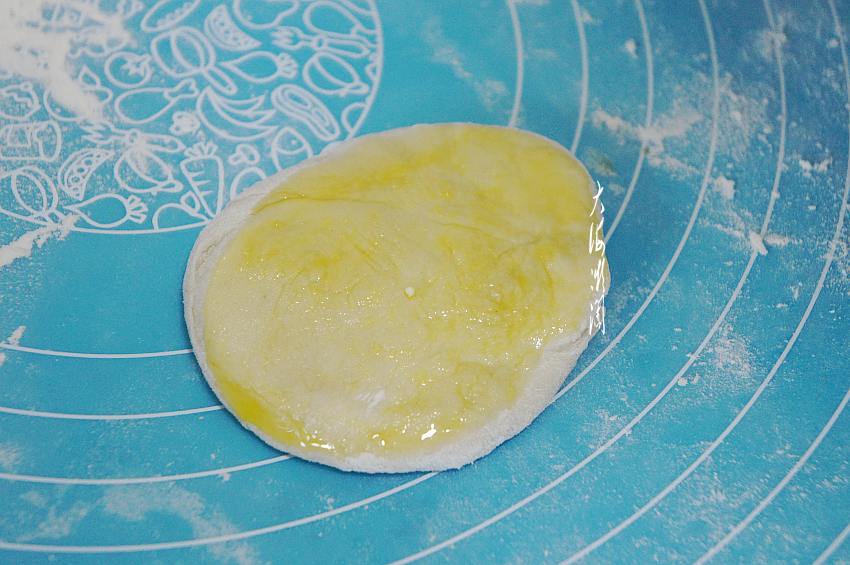 饧好的面团均匀地分成若干个小面剂子,取一个面剂子揉匀,尽量擀成圆形,薄薄地刷上一层大豆油,然后再撒点面粉。