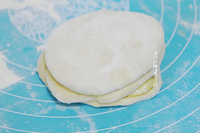 再擀一个圆饼摞在上边,以此类推,想做几层就摞几层,当然也要根据自家锅的大小而定,层数越多饼越大,大锅就可以多摞几层。