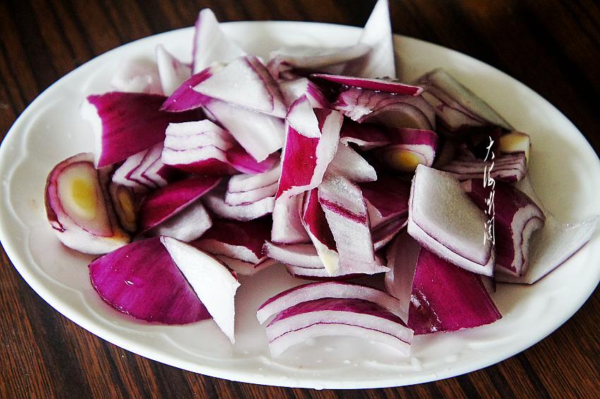 洋葱斜切小块,冬天一定要常吃洋葱,享有“菜中皇后”的美誉,营养价值高,它不仅含有钾、维生素C、叶酸、锌、硒,以及一些纤维素等等,它还含有植物的杀菌素和大蒜素,经常吃点洋葱可以解表开窍,改善微循环,改善心脑血管动脉硬化的状态,还有消炎杀菌、抗感冒的作用。而且它有极高的抗氧化能力,对促进肝脏脂肪代谢有很好的效果,洋葱本身是消脂肪的食物,所以减肥的人群可以搭配进食洋葱来达到减肥的效果。