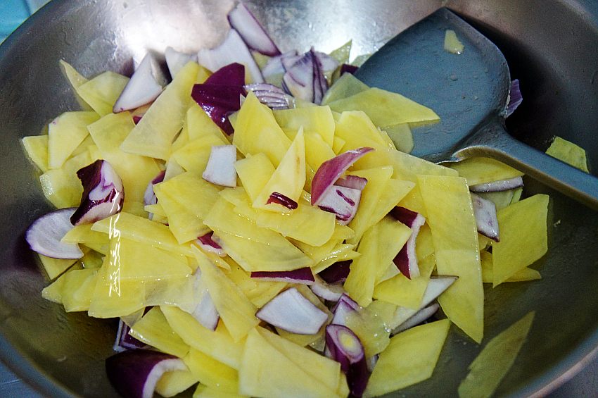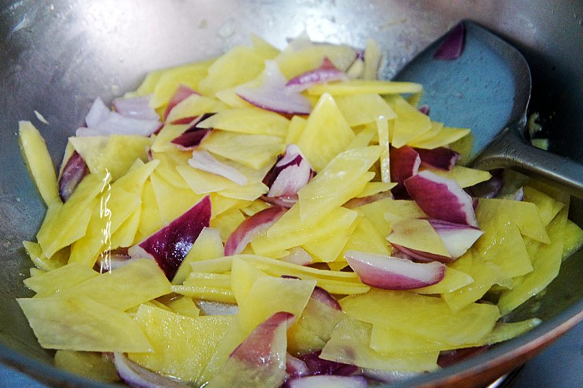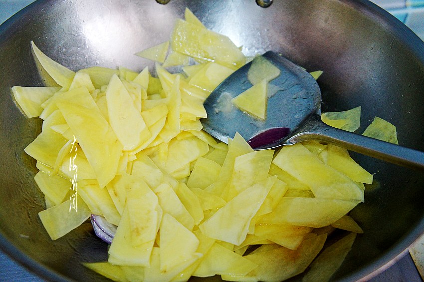 炒锅加入适量的油,爆香五香粉少一点洋葱,然后加入土豆片翻炒,炒至土豆片断生。