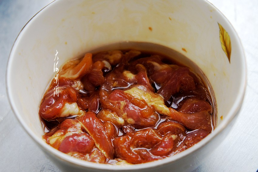 准备食材,猪瘦肉洗净切片,装入碗中,加入适量的料酒、生抽、淀粉、少许油,抓匀腌制10分钟左右。猪瘦肉富含蛋白质、脂肪、碳水化合物以及多种维生素,还含有钙、磷、铁钾、钠、锌等微量元素,有助于促进身体发育,具有补肾养血、滋阴润燥、补中益气、保护皮肤的功效。